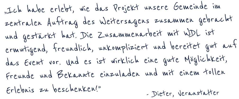 Du kennst deinen Ort und dein Team – wir haben jahrelange Erfahrung in Konzertorganisation. Wir freuen uns, wenn das zusammenkommt und ein Konzert bei Euch zum Segen für viele Menschen wird!
