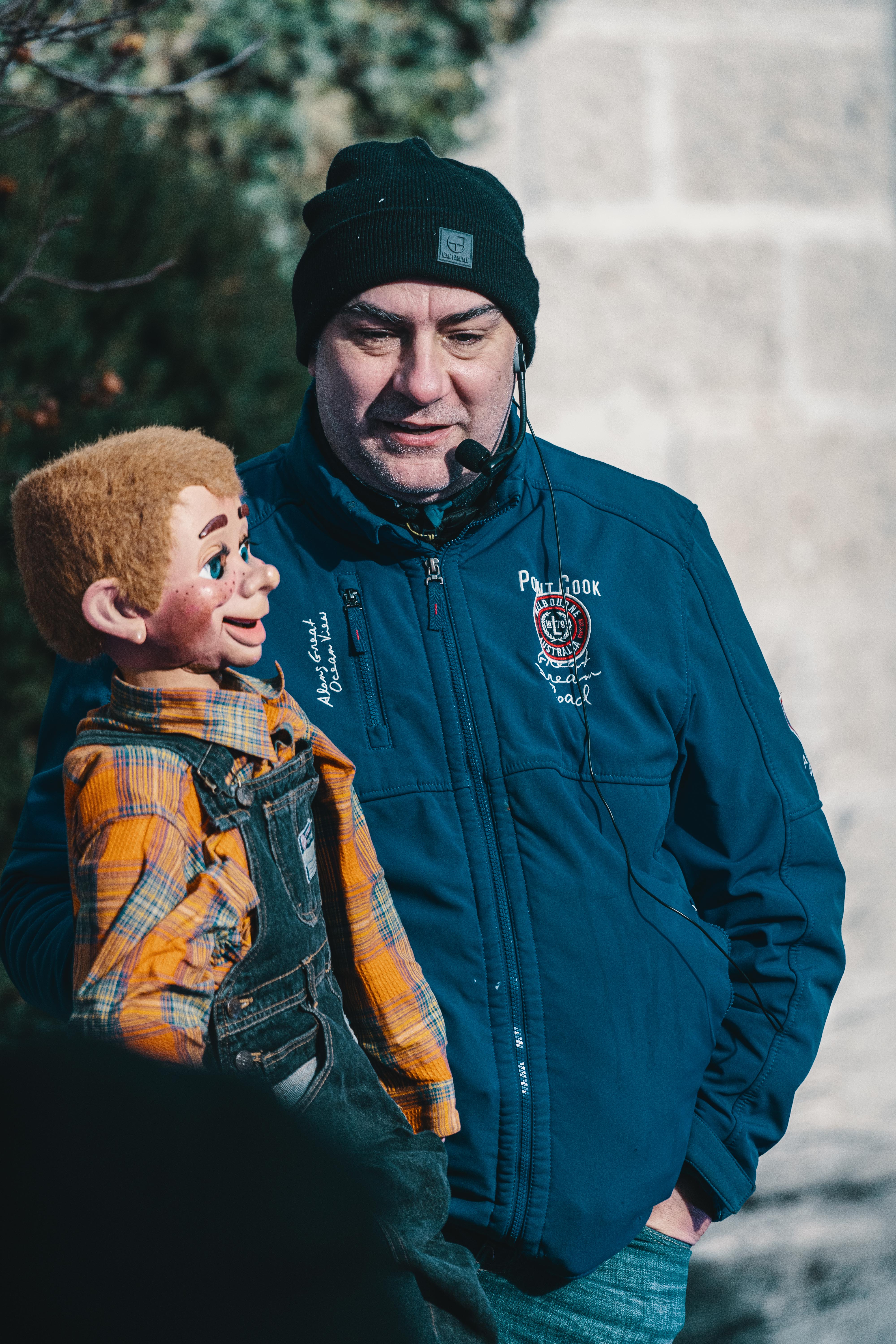 Lassen Sie sich von der Bauchrednerpuppe Kalle zum lachen bringen.